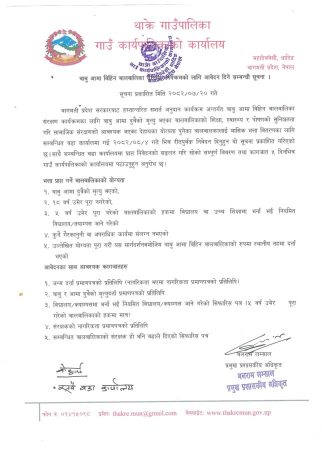 बाबु आमा बिहिन बालबालिका संरक्षण कार्यक्रमको लागि आवेदन दिने सम्बन्धी सूचना ।