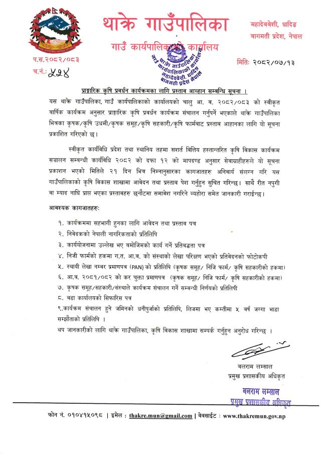 प्राङ्गारिक कृषि प्रबर्धन कार्यक्रमका लागि प्रस्ताव आव्हान सम्बन्धी सूचना ।
